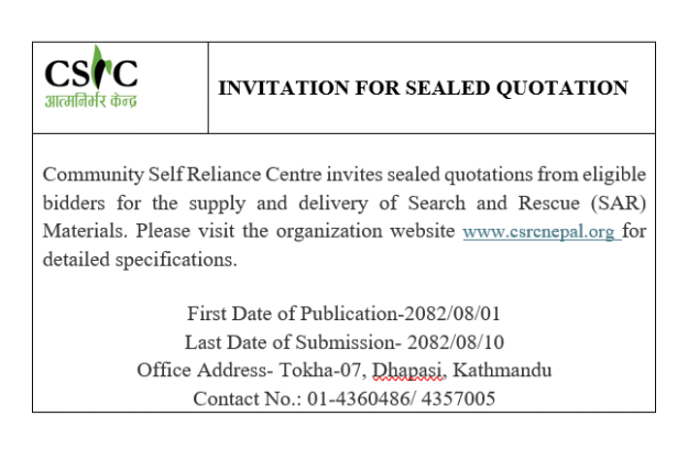 Invitation for Sealed Quotation AnnouncementsBy CSRC NepalNovember 17, 2025Call Quotation for the SAR Materials_ FinalDownload