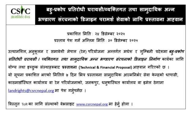 Invitation for Proposal for Grain Storage Design AnnouncementsBy CSRC NepalDecember 24, 2025ToR_Grain Storage Design_EnglishDownload