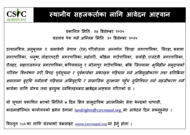 Call for Applications for Local Facilitators AnnouncementsBy CSRC NepalDecember 24, 2025TOR_Local Facilitator MobilizationDownload