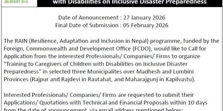 Jan282026 Facebook X Pinterest LinkedIn 1 CfA Notice_ Caregivers TrainingDownload Category: AnnouncementsPost navigationPreviousPrevious post:Monthly Communique December 2025NextNext post:ToR for ConsultancyYou Might Be InterestedToR for ConsultancyJanuary 28, 2026Invitation for Proposal for Grain Storage DesignDecember 24, 2025Call for Applications for Historical Flood MarkingDecember 24, 2025Call for Applications for Local FacilitatorsDecember 24, 2025Invitation for Sealed ProposalDecember 22, 2025