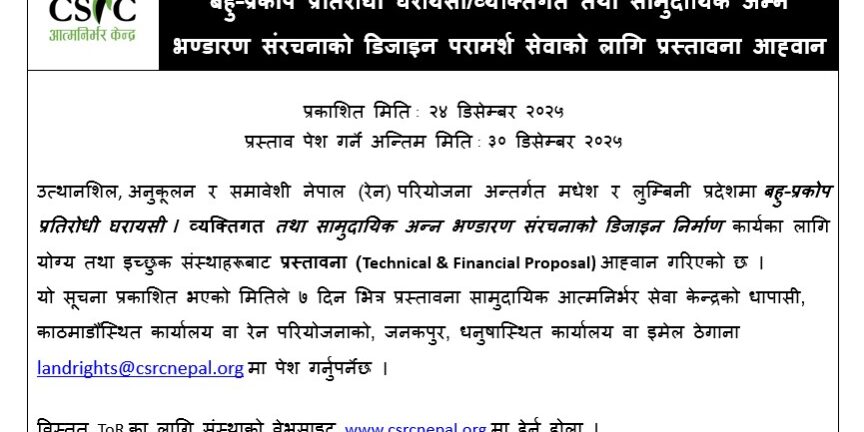 Dec242025 Facebook X Pinterest LinkedIn ToR_Grain Storage Design_EnglishDownload Category: AnnouncementsPost navigationPreviousPrevious post:Call for Applications for Historical Flood MarkingYou Might Be InterestedCall for Applications for Historical Flood MarkingDecember 24, 2025Call for Applications for Local FacilitatorsDecember 24, 2025Invitation for Sealed ProposalDecember 22, 2025